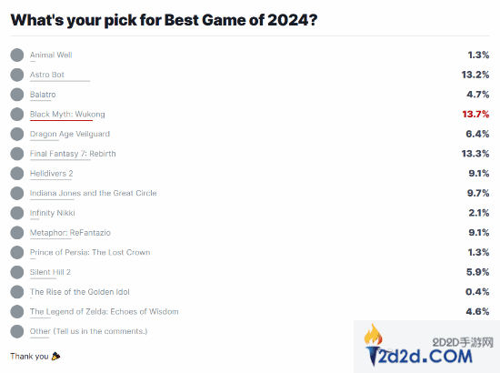 截至发稿前,官网显示已有16619名玩家参与年度最佳游戏投票,《黑神话:悟空》反超《宇宙机器人》,以13.7%的支持率排名第一!