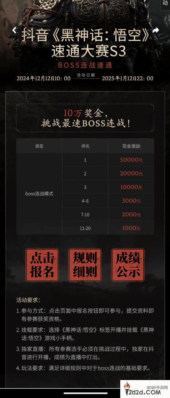 抖音召开《黑神话:悟空》Boss连战速通大赛!10万奖金等你拿