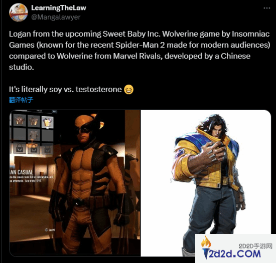 该博主直言不讳地吐槽,《漫威金刚狼》在平权组织Sweet Baby的“建议”下,塑造的洛根形象显得“雌激素拉满”,失去了金刚狼一贯的硬汉气质;而《漫威争锋》中金刚狼充满阳刚之气的设计则更符合大众对这一角色的期待。