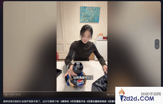 知名主播女流日前在抖音里分享了一段《黑神话:悟空》联名葫芦礼盒的开箱视频,从视频里可以看到,礼盒里除了有一罐联名可乐之外,还有一个印有百事可乐、《黑神话:悟空》Logo与金色祥云图案的黑色大葫芦。女流也展示了自己喝可乐的方式——将联名可乐瓶直接放在葫芦里。
