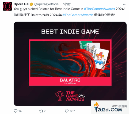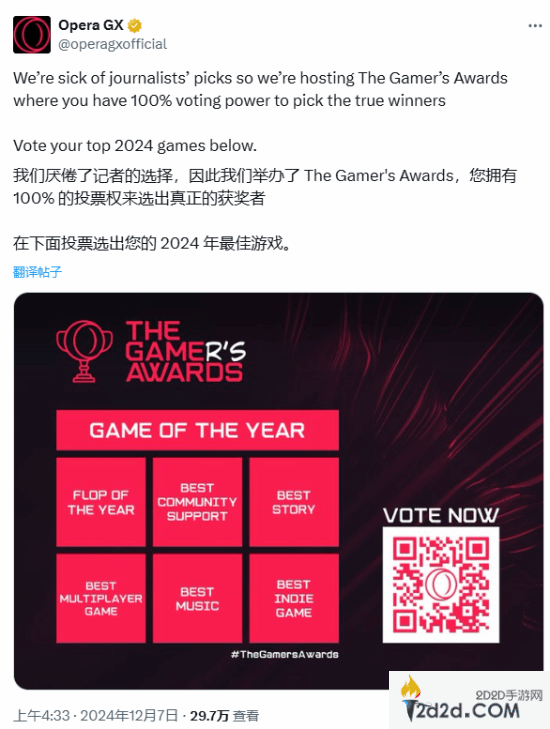 据悉,Opera GX曾表示他们已经厌倦了游戏媒体记者的评选,所以才举办了这项投票活动,由玩家们100%投票决定真正的赢家。