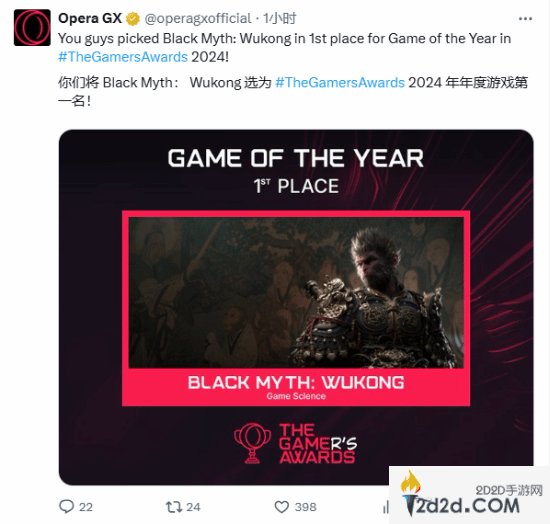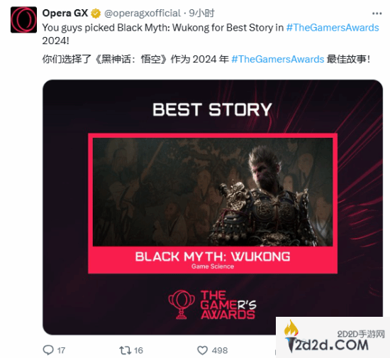 日前,Opera GX官方公开了自己举办、但是完全由玩家投票的游戏大奖结果,其中《黑神话:悟空》获得了年度最佳游戏大奖与最佳叙事大奖。除此之外,《地狱潜者2》获得了最佳多人游戏大奖,《小丑牌》获得了最佳独立游戏大奖。值得一提的是,《星鸣特攻》获得了年度最糟糕游戏大奖。
