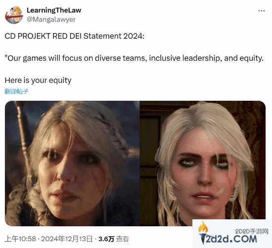 外网博主@Mangalawyer发布了一张对比图,将《巫师3》和《巫师4》中的希里形象进行了对比,并讽刺道:“CDPR 2024年多元化宣言:‘我们的游戏将聚焦于多元化团队、包容性领导以及公平性。’——这就是你们的公平性。”