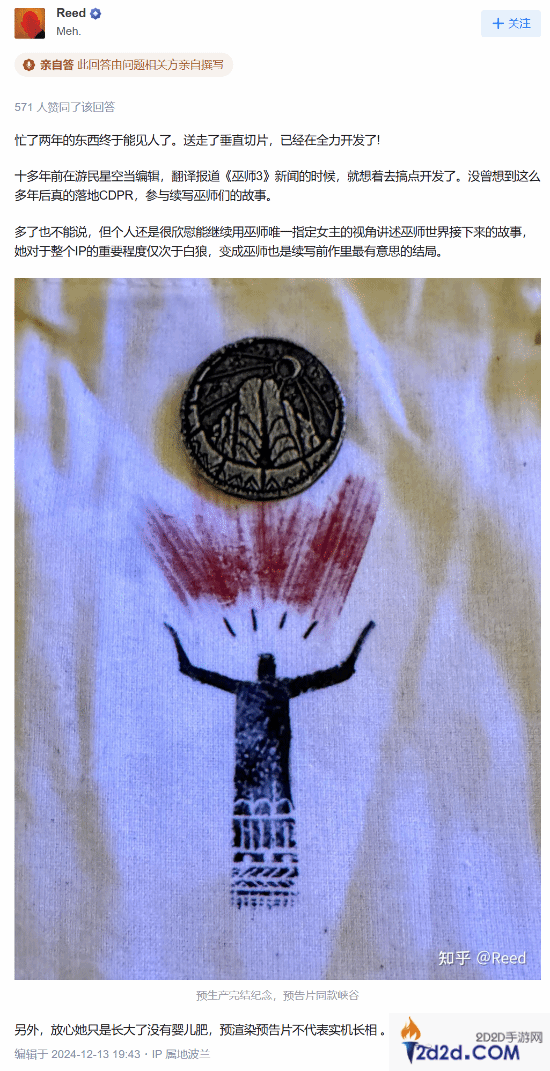 “忙了两年的东西终于能见人了。送走了垂直切片,已经在全力开发了!十多年前在盟里手游网当编辑,翻译报道《巫师3》新闻的时候,就想着去搞点开发了。没曾想到这么多年后真的落地CDPR,参与续写巫师们的故事。多了也不能说,但个人还是很欣慰能继续用巫师唯一指定女主的视角讲述巫师世界接下来的故事,她对于整个IP的重要程度仅次于白狼,变成巫师也是续写前作里最有意思的结局。另外,放心她只是长大了没有婴儿肥,预渲染预告片不代表实机长相 。”