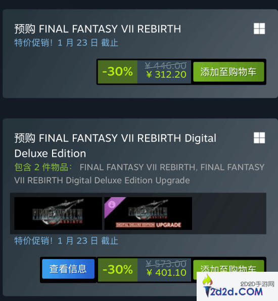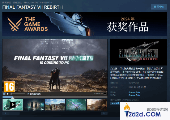 《最终幻想7:重生》已宣布将于2025年1月23日登陆PC平台,目前该作已在Steam开启预购,限时特价促销七折,标准版312.2元,豪华版售价401.1元。