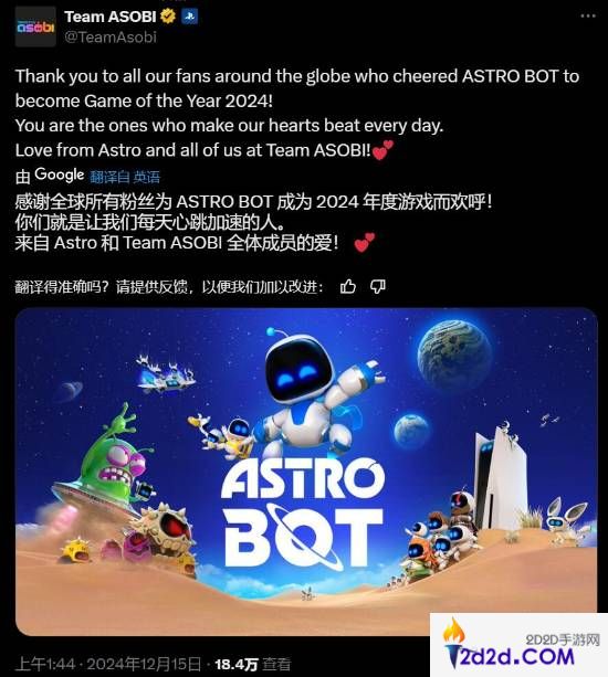 TGA已过去两天,工作室Team ASOBI今日凌晨发文,感谢全球所有粉丝为《宇宙机器人》成为TGA2024年度游戏而欢呼,并展示了自己满满的爱。
