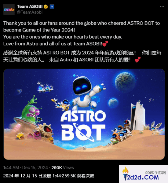 “感谢全球所有粉丝的支持,将《宇宙机器人》推上了2024年度最佳游戏的宝座!是你们让我们每天充满激情和动力。—来自Astro和Team ASOBI全体团队的爱!”