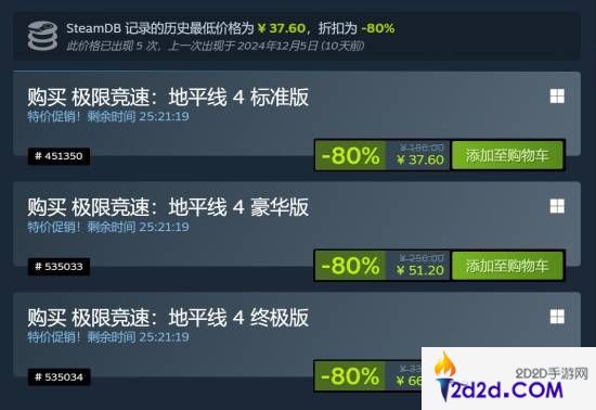 目前《极限竞速:地平线4》在Steam上2折优惠中,标准版37.6元、豪华版51.2元、终极版66.6元。