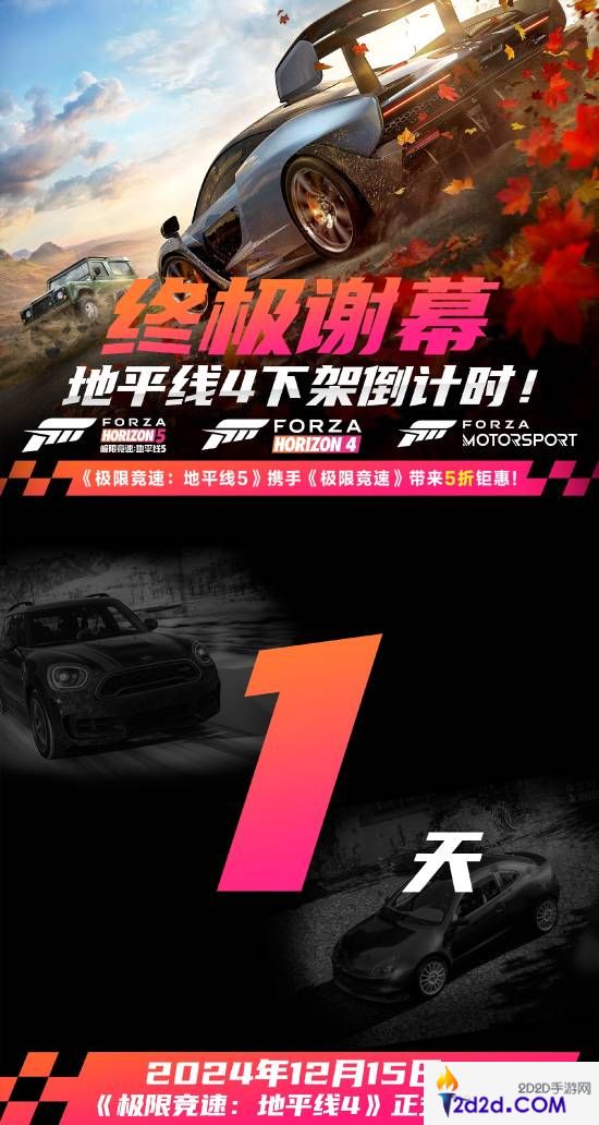 由于许可证到期,《极限竞速:地平线4》将于12月15日(当地时间)全平台永久下架,不再可供购买。今日极限竞速官方发布倒计时1天海报,提醒感兴趣的广大玩家及时购入本作。