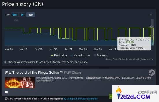 SteamDB数据显示,Steam平台的《魔戒:咕噜》于昨日开启特卖活动,刷新历史最低价格。上次优惠力度还是3折,而这次的力度高达1折,国区新史低价19.9元!活动持续至12月20日。