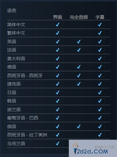 而根据Steam商店页面的最新信息,玩家将能在本作中体验到多种语言的配音,包括英语、法语、德语、西班牙语、捷克语以及俄语。