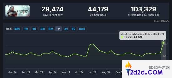 根据SteamDB的数据,最近24小时内,《巫师3》在Steam上的玩家数达到了44,179人,创下了2024年的新高。对于一款接近十年的游戏来说,这一成绩堪称不小的奇迹。