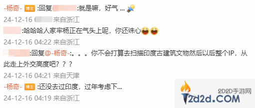 还有玩家调侃:“小杨,此番游历可见得那佛祖真面目?那大雄宝殿上端坐的可是慈悲心肠的得道佛祖?”杨奇再次表示:“还没去过印度,过年考虑下...”一位玩家表示:“哈哈哈人家牢杨正在气头上呢,你还诛心。”杨奇说道:“就是嘛,好气...”