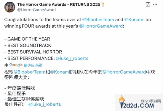 虽然,《寂静岭2》重制版没能在TGA颁奖典礼上绽放异彩,但在2024年度恐怖游戏大奖颁奖典礼上,本作夺得了年度最佳恐怖游戏大奖。