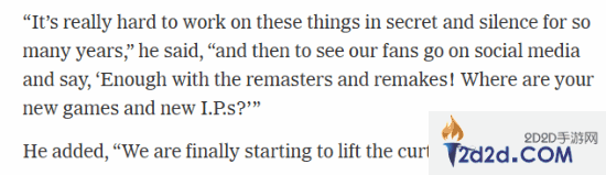 在接受《纽约时报》采访时,Neil Druckmann表示自己非常清楚粉丝的想法——觉得顽皮狗公布下一部作品的时间太漫长。“多年来在秘密和沉默中制作这些作品真的非常困难,”Neil Druckmann说道,“然后看到我们的粉丝在社交媒体上说,‘够了,都是这些重置版和复刻合集!你们的新游戏和新IP在哪里?’”Neil Druckmann补充道:“我们终于开始揭开这个项目的面纱了。”