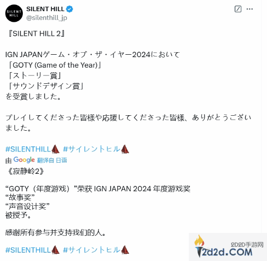 《寂静岭2RE》获IGN日本年度最佳!官方发文感谢
