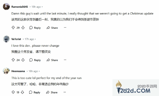 还有网友表示:“该死的,这家伙非等到最后一刻,我真的以为我们不会收到圣诞更新了。”