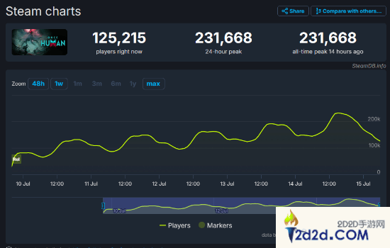 SteamDB数据显示,网易免费开放世界生存游戏《七日世界》Steam在线峰值已突破23万人,相比首发时的13万人又增加了10万人,火爆程度可见一斑。