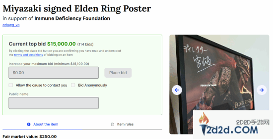 随着《艾尔登法环》的大火,让制作人宫崎英高更加享誉业界。据外媒gamesradar报道,一幅由宫崎英高亲自签名的《艾尔登法环》海报现已在Tiltify网站上进行拍卖,截止发稿前,拍卖价格已经达到了惊人的数值,为1.5万美元。