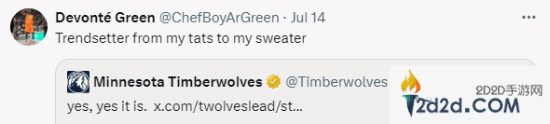 前NBA球员德文特·格林也在手臂上纹了GTA作弊码,他回复了森林狼的推文称自己“从纹身到毛衣,都是潮流引领者”。