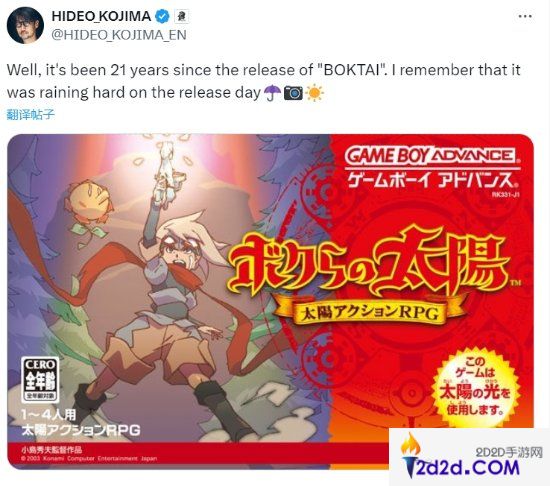 小岛秀夫近日在推特上发文纪念了他在世纪初时为GBA制作的一款经典作品的21岁生日——《我们的太阳》,他表示“我记得那天下了很大的雨”。
