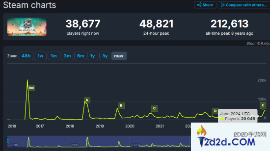 游戏热度在近期也有显著提升,据Steamdb数据显示,更新上线后仅24小时内,就有超过48499名玩家涌入《无人深空》,据悉,这是自2019年8月以来该游戏玩家数量最大的一次激增。