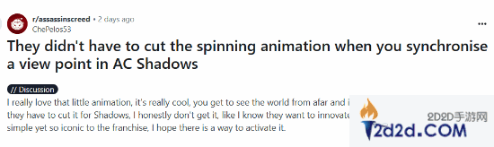据外媒fandomwire报道,由于《刺客信条:影》里并未出现此动画,很多玩家对此感到非常不满。有玩家在Reddit论坛里发帖指出,育碧在《刺客信条:影》里删除视点同步旋转动画是一个错误。
