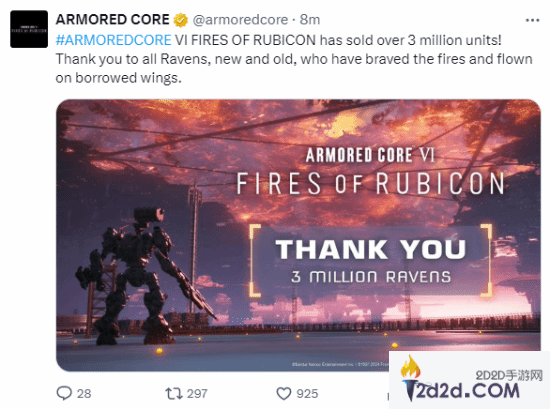 《装甲核心6:境界天火》销量已突破300万套,官方发布推文感谢玩家们的支持。