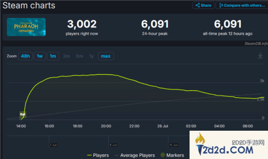 自2023年10月发售以来,《全面战争:法老》就一直处于不温不火的状态。比起本作粉丝们更加喜欢《全战:三国》或是《全战:战锤3》。而在免费扩展包“王朝”上线后,《全面战争:法老》的玩家持续增加,Steam同时在线峰值达到最高6091人,超越《全面战争:法老》发售时的峰值。